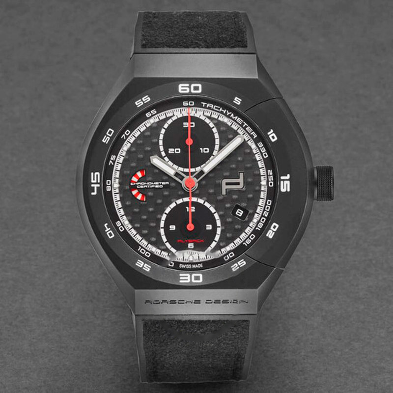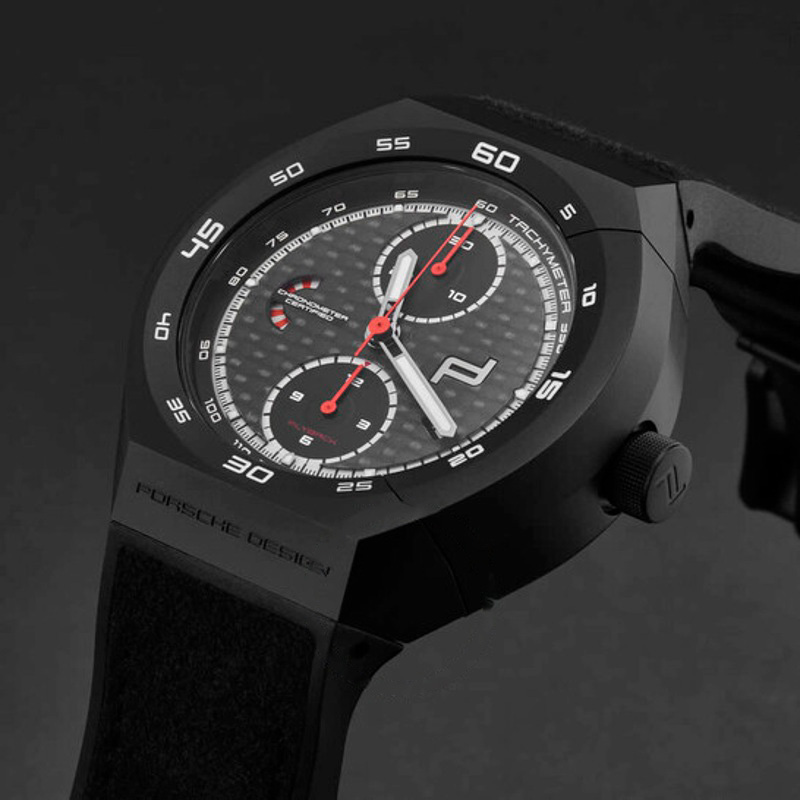 O Porsche Design Cronógrafo Flyback com atuador monobloco e mostrador preto automático 45 mm Interpreta os códigos da casa com serenidade e atenção à luz. Caixa em titânio, Mostrador preto, 45 mm.